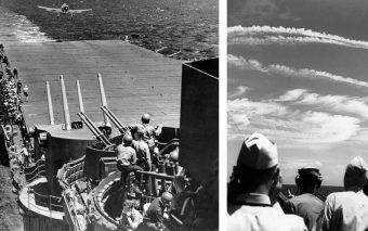 Ogień amerykańskiej obrony przeciwlotniczej na lotnisku Yontan (fot. T.Sgt. Chorlest, ze zbiorów National Archives and Records Administration, domena publiczna).