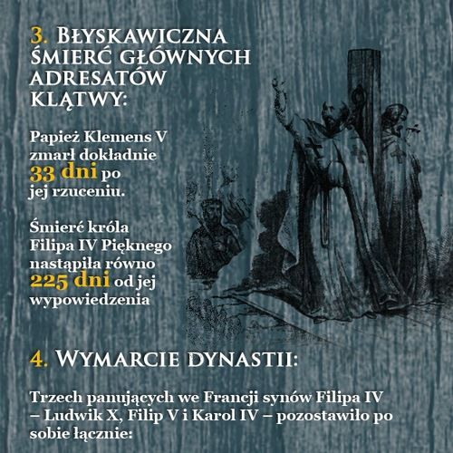 Szybkie i nagłe zgony, krótkie rządy, bezdzietność. Ciąg wydarzeń, jaki nastąpił we Francji wkrótce po śmierci ostatniego mistrza templariuszy, wciąż elektryzuje. Czy faktycznie rzucił on klątwę? W naszej infografice znajdziecie przyczyny przeświadczenia, że tak właśnie było.