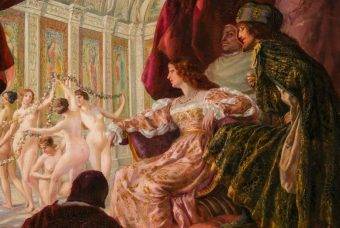 fot.domena publicznaLukrecja z ojcem-papieżem i bratem. Stoi między swoimi kochankami, czy ludźmi, którzy wykorzystywali ją dla swych politycznych celów? Obraz „Puchar wina z Cezarem Borgią” Johna Colliera.