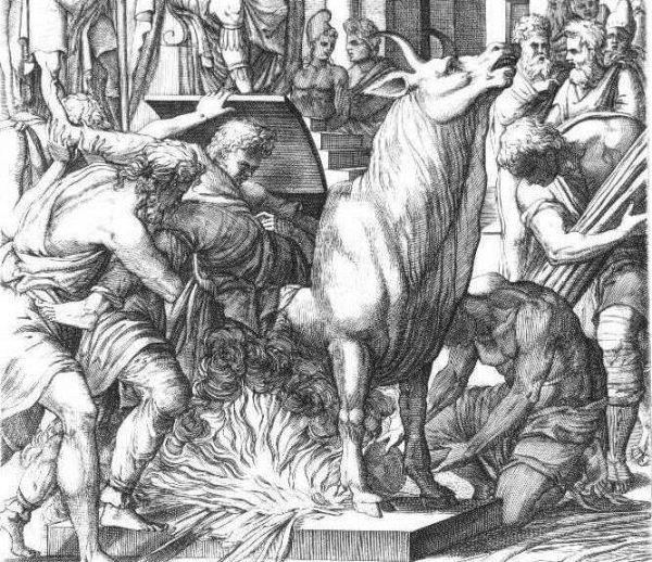 Niestety, pomysł się przyjął i kilku chrześcijańskich męczenników zginęło w ten sposób, w tym św. Eustachy Rzymski i św. Antypas z Pergamonu. Dante uwiecznił tę straszliwą torturę w Boskiej Komedii.