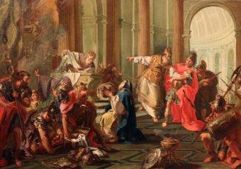Świętego Prymusa Rzymianie zmusili do wypicia rozpuszczonego ołowiu. Niccolò Circignani zwany il Pomarancio, „Męczeństwo św. Prymusa” (autor: Alkjds, licencja: CC BY-SA 4.0).