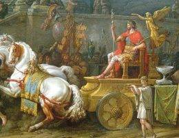 fot.domena publicznaDetal z obrazu „Triumf Emiliusza Paulusa”. Emiliusz Paulus w kwadrydze triumfalnej, której mógłby ostatecznie nie uzyskać, gdyby nie zagrywka Serwiliusza Puleksa