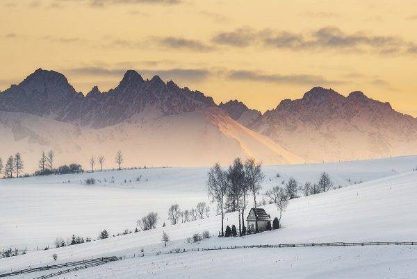 Zdjęcie wyróżnia się przemyślaną kompozycją, gdzie śnieg i światło tworzą niemal monochromatyczny efekt, ukazując zabytek jako integralną część krajobrazu.