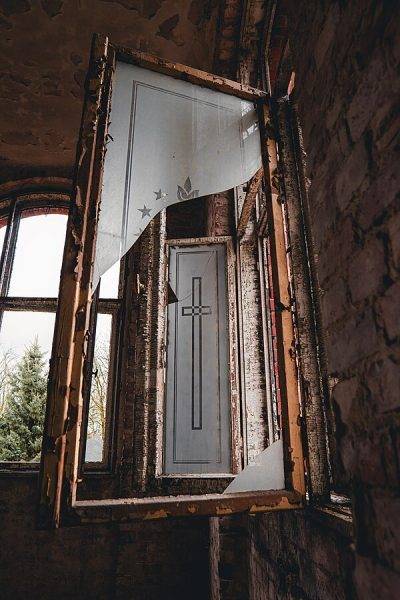 - Pozostałości witraży w szpitalu hutniczym w Katowicach – autor: Jerychoo