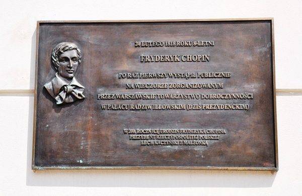 Tablica upamiętniająca pierwszy publiczny koncert Chopina (1818) na fasadzie Pałacu Prezydenckiego w Warszawie