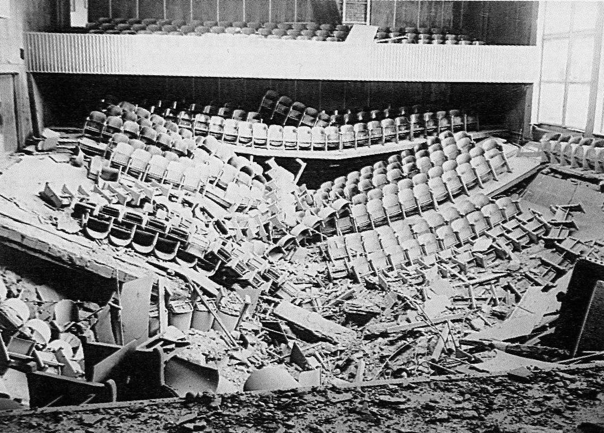 Eksplozja zdewastowała aulę Wyższej Szkoły Pedagogicznej, rozsadziła podłogę, wysadziła dach i oczywiście zniszczyła wnętrze. Na zewnątrz unieruchomiła stację transformatorową, toteż w najbliższej okolicy zapanowała ciemność.