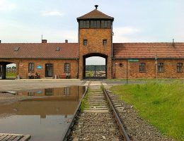 fot. Stanisław Mucha / Bundesarchiv B 285 Bild-04413Tory kolejowe, wartownia i brama główna Auschwitz II (Birkenau), widok z rampy wewnątrz obozu, 1945