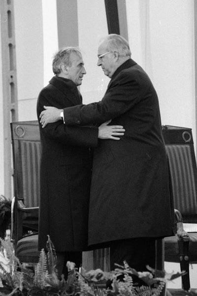Premier Tadeusz Mazowiecki i kanclerz Helmut Kohl podczas spotkania w Krzyżowej (1989)