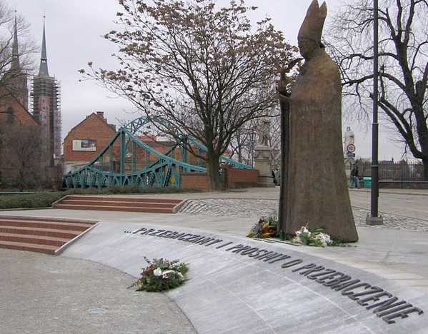 Pomnik kard. Kominka we Wrocławiu ze słynnym cytatem z Orędzia, odsłonięty w 40. rocznicę jego opublikowania