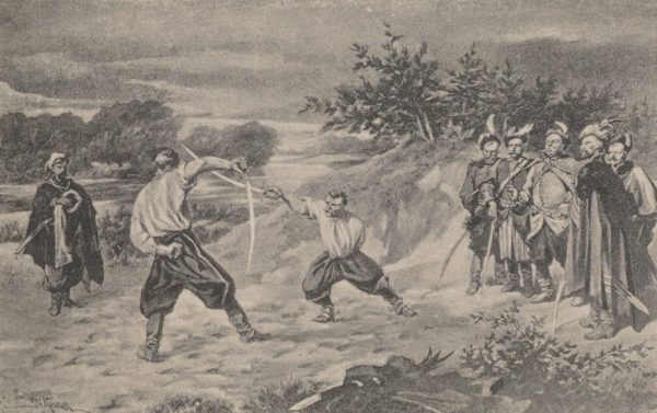 fot.Rysunek Julisza Kossaka przedstawiający pojedynek na szable Wołodyjowskiego z Bohunem (domena publiczna).W szlacheckiej Polsce bywało, że jedna i ta sama wieś miała dwóch właścicieli. Pomiędzy takimi częściami wsi trwała regularna wojna podjazdowa, w której wszystkie chwyty były dozwolone.