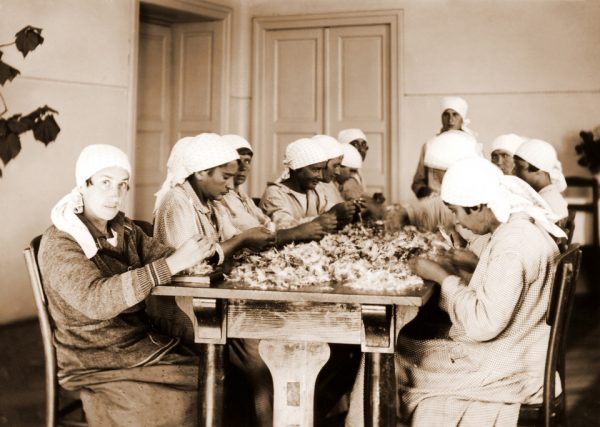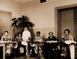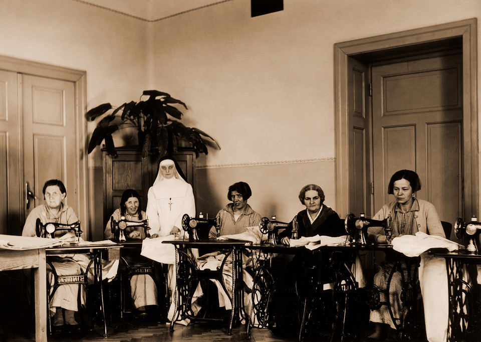 Terapia zajęciowa. Na zdjęciu zakonnica pełniąca służbę pielęgniarską i grupa pacjentek. Fotografia z okresu międzywojennego.