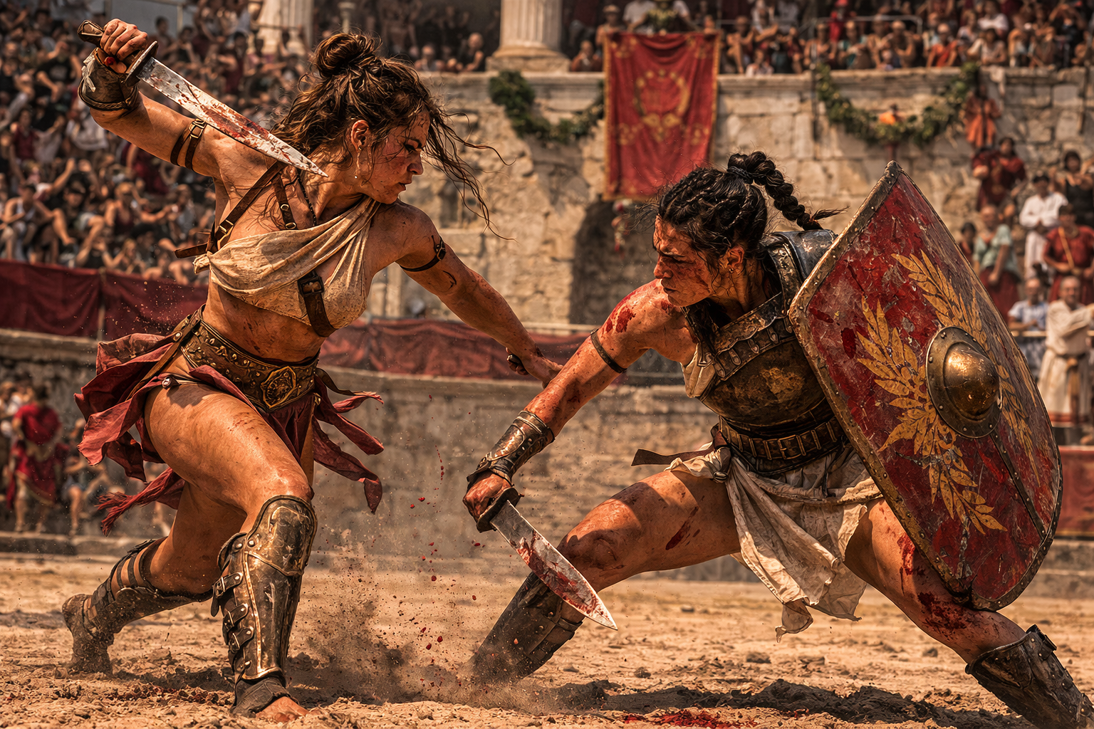 Za panowania Tytusa – o czym pisali zarówno Kasjusz Dion, jak i Marcjalis – podczas igrzysk inaugurujących otwarcie amfiteatru wystąpiła łowczyni zwierząt. Zdarzały się zresztą wzmianki o tym, że kobiety zmuszano również do walki ze zwierzętami. O jednej z nich wspomina Juwenalis, pisząc o Mewii, która z nagą piersią miała przebić na arenie toskańskiego dzika. Nie zachowały się natomiast jednoznaczne wzmianki o tym, by gladiatorki walczyły z gladiatorami.
