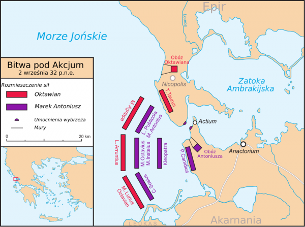 Nalegała, żeby Egiptu broniła blokada okrętów, która ciągnęła się od Cyreny w Afryce Północnej aż do Morza Jońskiego; według niej wojna miała się toczyć wyłącznie na morzu. Zgodnie z tym Antoniusz, dysponujący 500 okrętami i 70 tysiącami żołnierzy, założył obóz na wysuniętym w morze skrawku lądu w Akarnanii w zachodniej Grecji, u wejścia do Zatoki Ambrakijskiej. Miejsce to było znane jako Akcjum – „przylądek”.