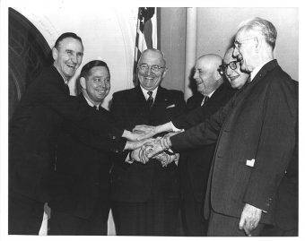 Prezydent Harry S. Truman ogłasza koniec II wojny światowej w Europie (fot. ze zbiorów National Archives and Records Administration, domena publiczna).